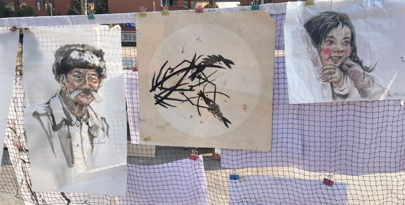 ??除了傳統(tǒng)書畫外,一些創(chuàng)新的作品格外引人注目。例如,利用帆布包、舊紙袋、衣服做成的書法文創(chuàng),既環(huán)保又具創(chuàng)新性,展現(xiàn)了學(xué)生們對(duì)傳統(tǒng)藝術(shù)的全新解讀和探索。