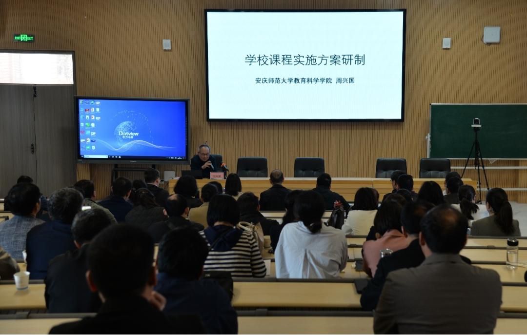 安慶師范大學(xué)教育科學(xué)學(xué)院的周興國(guó)教授作了題為“學(xué)校課程實(shí)施方案研制”的講座,闡述了學(xué)校課程實(shí)施方案研制的背景與意義、基本結(jié)構(gòu)、研制過(guò)程、存在的問(wèn)題以及研制時(shí)應(yīng)考慮的事項(xiàng)。周教授通過(guò)生動(dòng)的案例分析,幫助參與講座的學(xué)校準(zhǔn)確理解課程制定的要求,明確發(fā)展方向,為學(xué)校課程的實(shí)踐提供了明確的指導(dǎo)方案。
