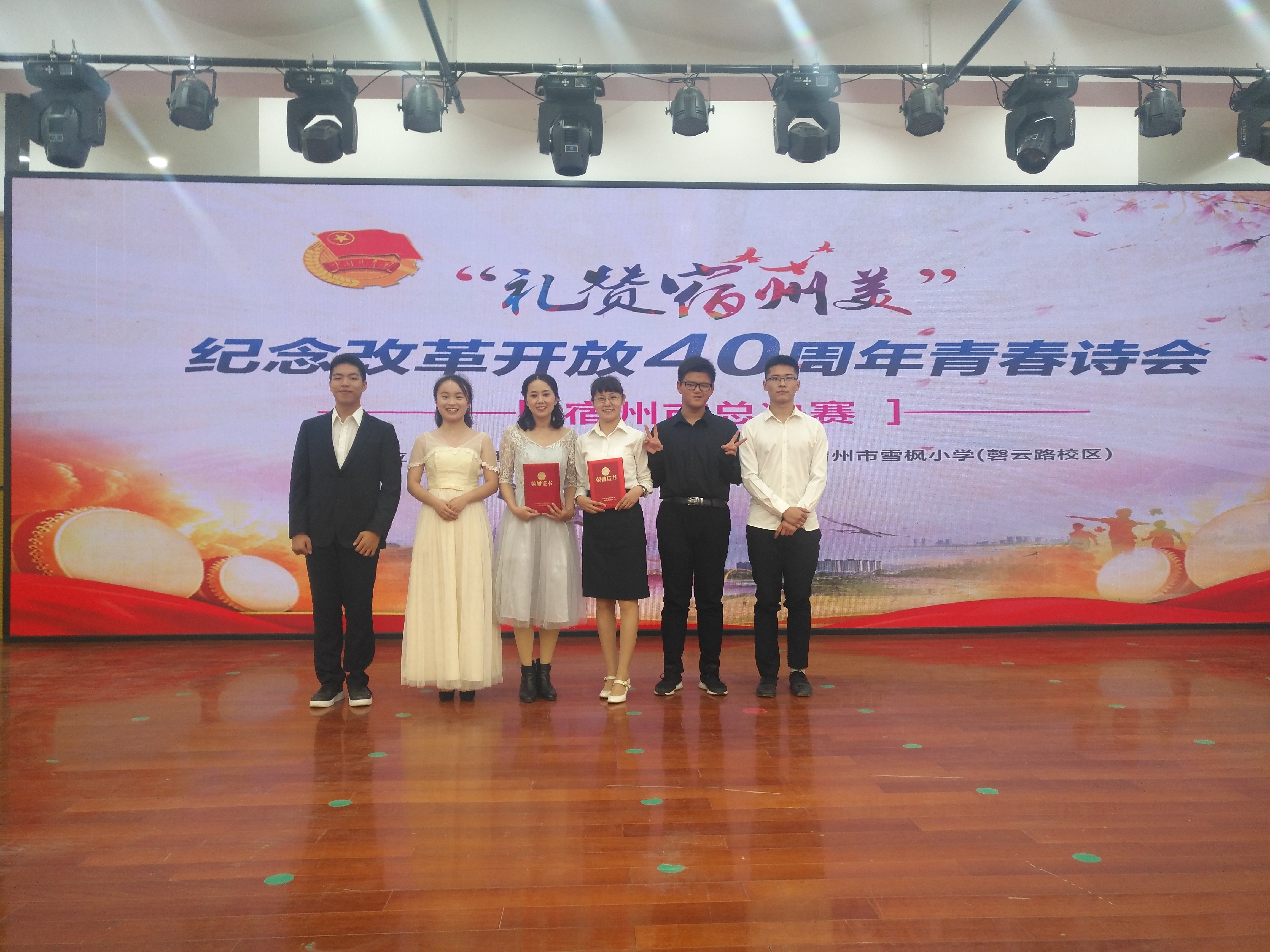 2018年9月28日共青團宿州市委在磬云路雪楓小學禮堂舉行了“禮贊宿州美”紀念改革開放40周年青春詩會,市直、泗縣、靈璧等地區(qū)三十多家單位選送了32個作品,我校張維維、朱蕾蕾老師帶領學生經過上午緊張的預賽挺進決賽,在激烈的決賽競爭中雙雙獲榮二等獎。
