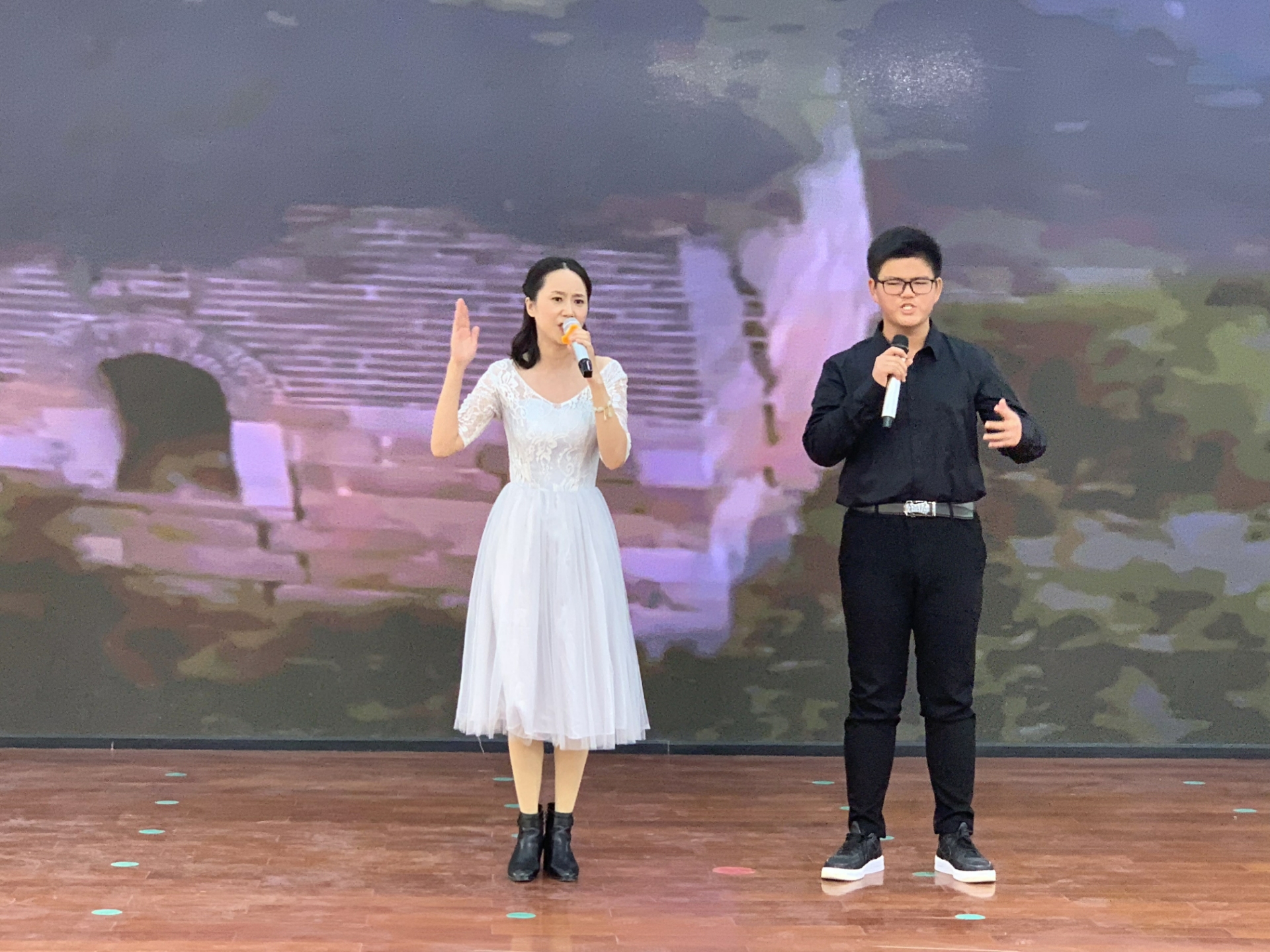 學校接到市團市委通知后,團委負責人朱德意老師立即將任務交給語文組教研組長陳煜老師,陳老師安排并指導語文老師張維維、朱蕾蕾帶領學生積極準備,選擇符合主題詩歌、制作背景視頻、字斟句酌揣摩詩歌情感,經過一周見縫插針地辛苦排練,張維維老師與高三24班學生曹夢杰合誦《中華頌》,朱蕾蕾老師帶領高三學生16班袁駿、26班武倩楠、2班王成龍合作朗誦《她在云中笑》。
