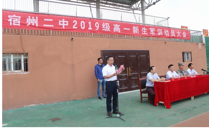初秋,宿州二中校園風景優(yōu)美。 9月1日上午7:30,宿州二中在運動場舉行2019級高一新生軍訓動員大會。 參加大會的有校長曹振鋒、紀委書記趙亮,副校長孫遜等學校領(lǐng)導,高一年級級部主任陳曉杰和全體班主任及學生,31602部隊參訓領(lǐng)導及教官。 儀式由政教處主任何許光主持。