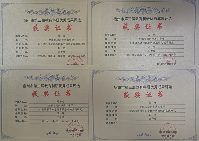 近日,宿州市第三屆教育科學研究優(yōu)秀成果評選結果公布,宿州二中喜獲佳績,無論是獎項數(shù)量,還是獎項質(zhì)量,都位居各校之首。