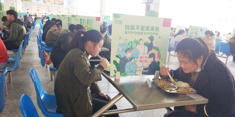 學(xué)校兩個(gè)食堂共計(jì)400張餐桌,每張餐桌限坐2人就餐,間隔1米,中間用隔板隔開。按照A、B、C座樓分時(shí)、分樓、錯(cuò)峰就餐方案,安排學(xué)生分三批就餐。每位同學(xué)固定窗口打飯,固定餐桌座位就餐,一人一具,一用一消毒。學(xué)生落實(shí)值班校干和值班班主任陪餐制度。
