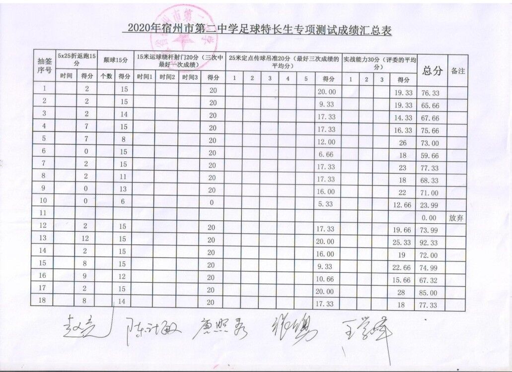 宿州二中2020年高一招生足球特長生專業(yè)課測試成績公示
