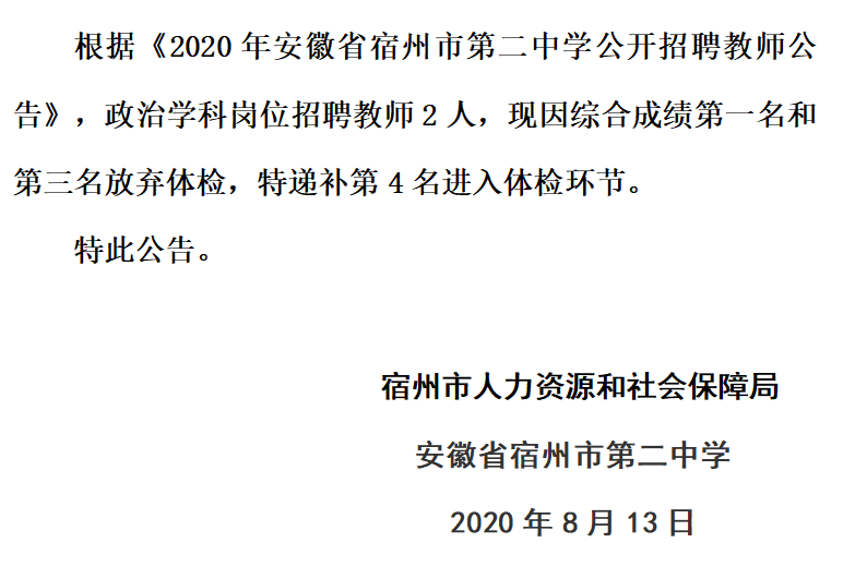 宿州二中2020年招聘教師遞補(bǔ)公告