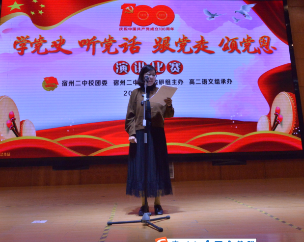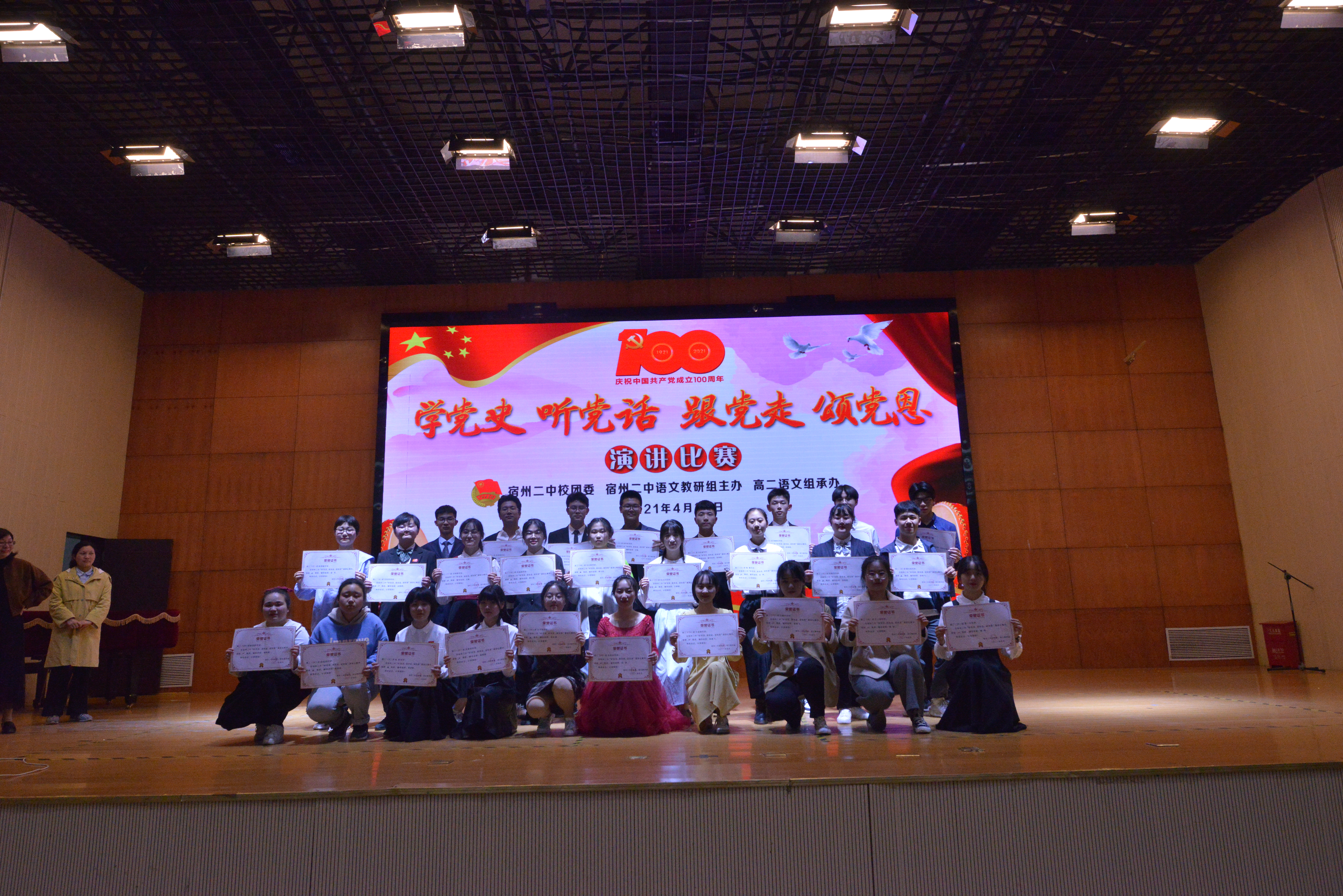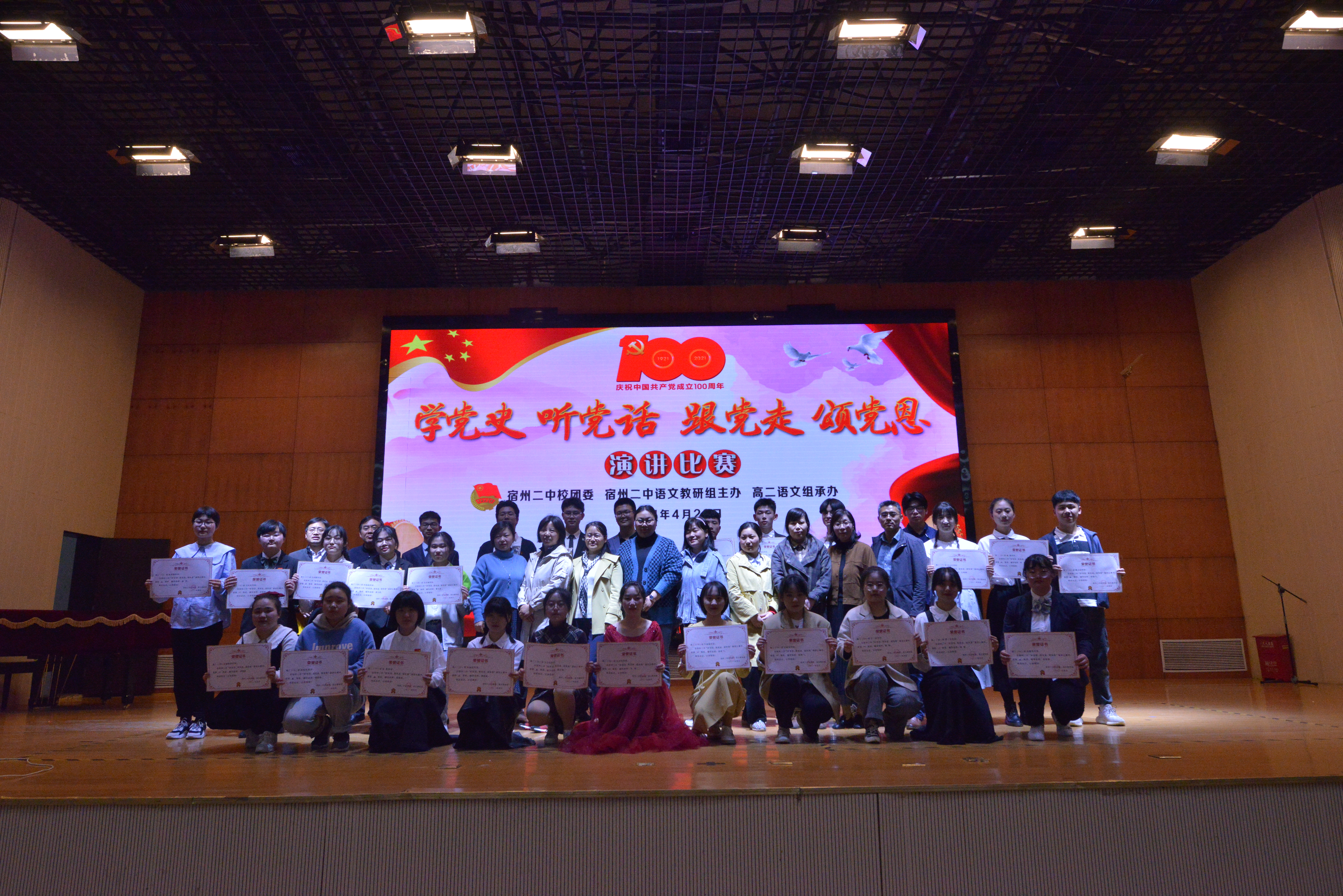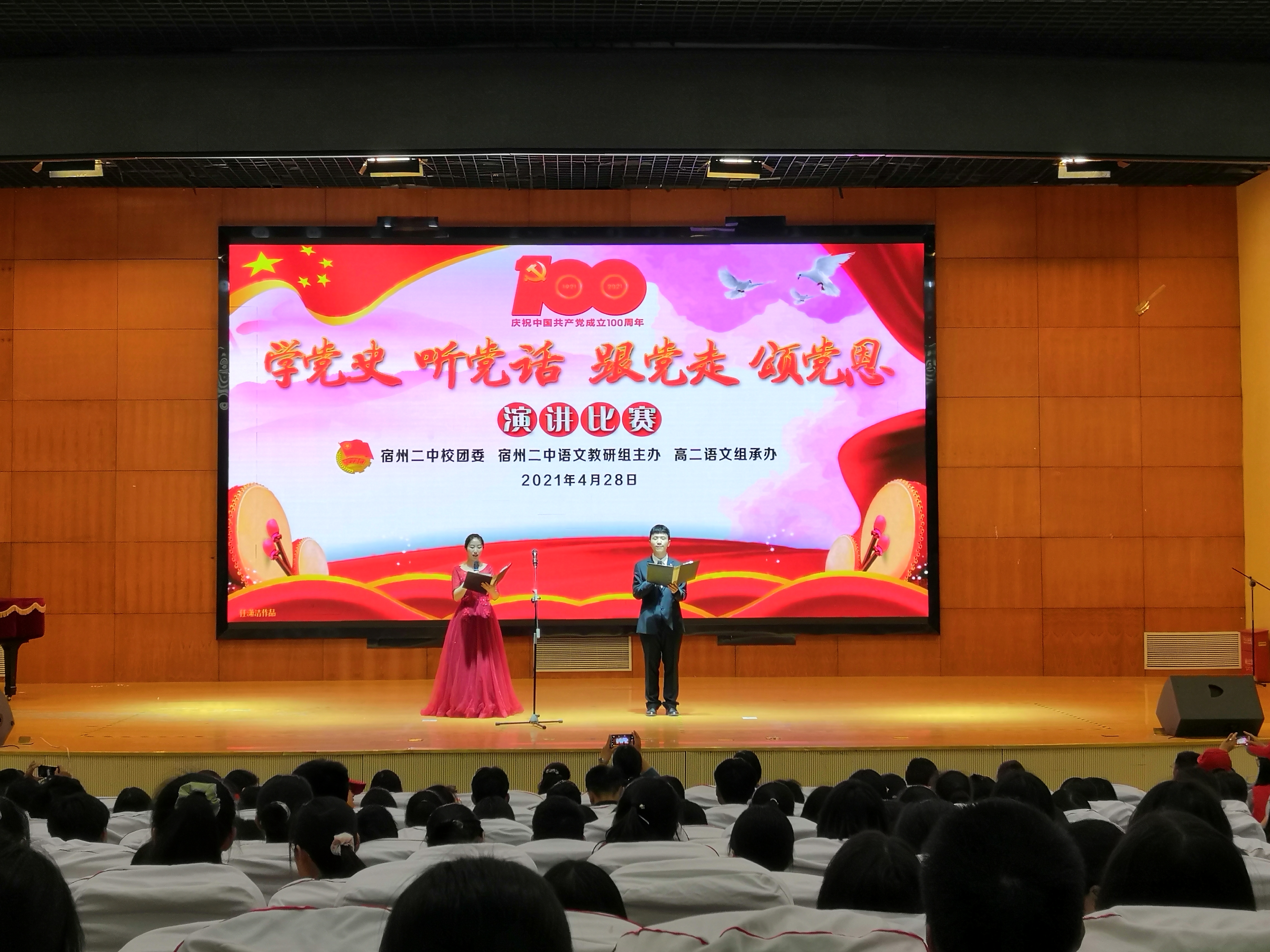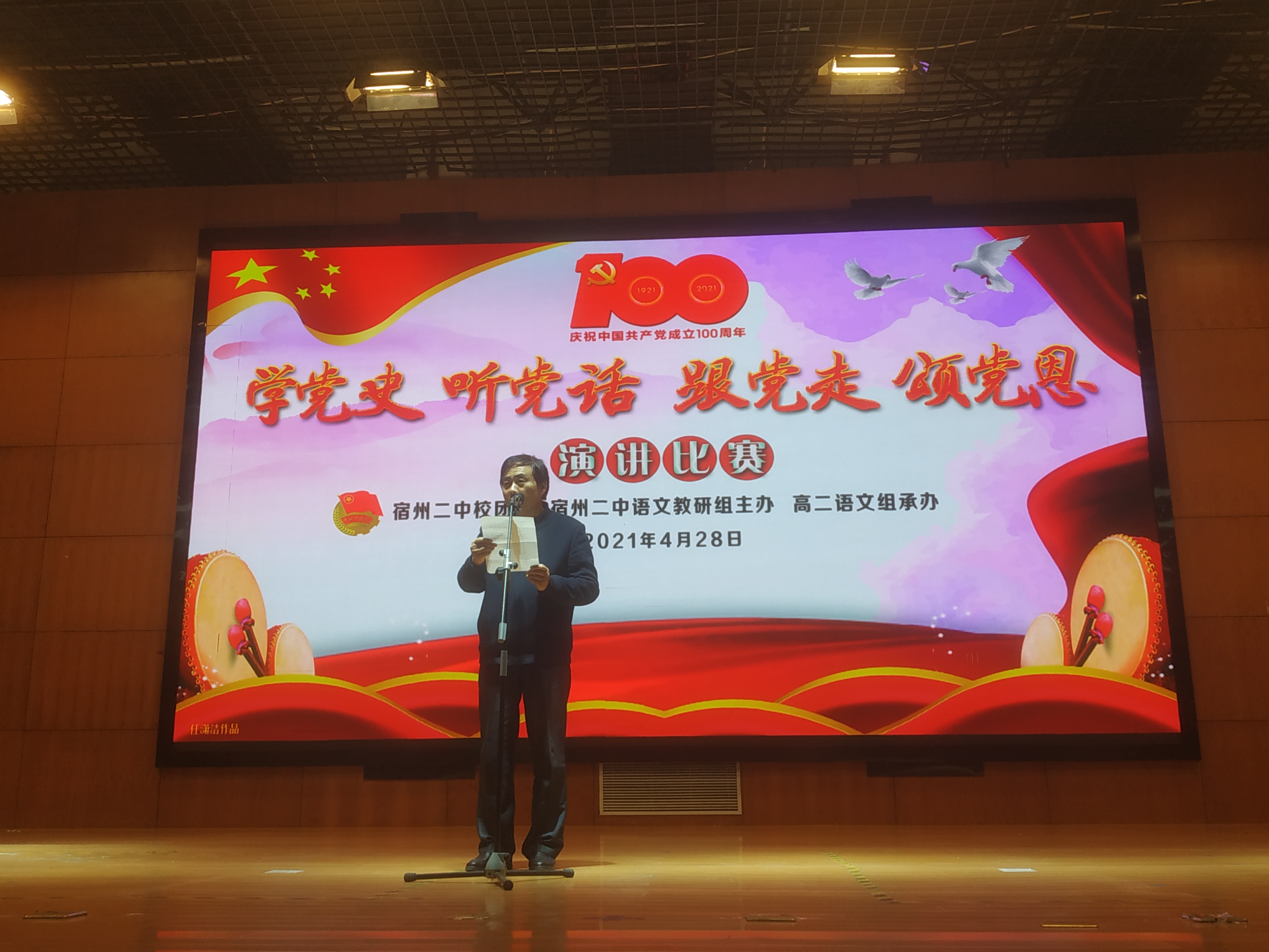 歲月逢春花滿地,學(xué)子頌黨恩如山。為慶祝中國共產(chǎn)黨誕辰100周年,推進(jìn)和諧校園建設(shè),提高學(xué)生綜合素質(zhì),2021年4月28日下午,由宿州二中團(tuán)委、宿州二中語文教研組共同主辦,高二語文組承辦的“讀黨史、聽黨話、跟黨走、頌黨恩”演講比賽在汴水講堂舉行。曹振鋒校長和王躍書記親臨現(xiàn)場觀看比賽,為選手們加油助威。宿州二中黨委委員吳立清副校長、團(tuán)委書記朱德意、高二年級主任陳曉杰蒞臨指導(dǎo),語文教研組王敏、過洋、任敏、王倩華、周彭、張雪莉、任瀟潔和王秋妹等八位擔(dān)任評委。高二年級部分老師參加了這次活動。